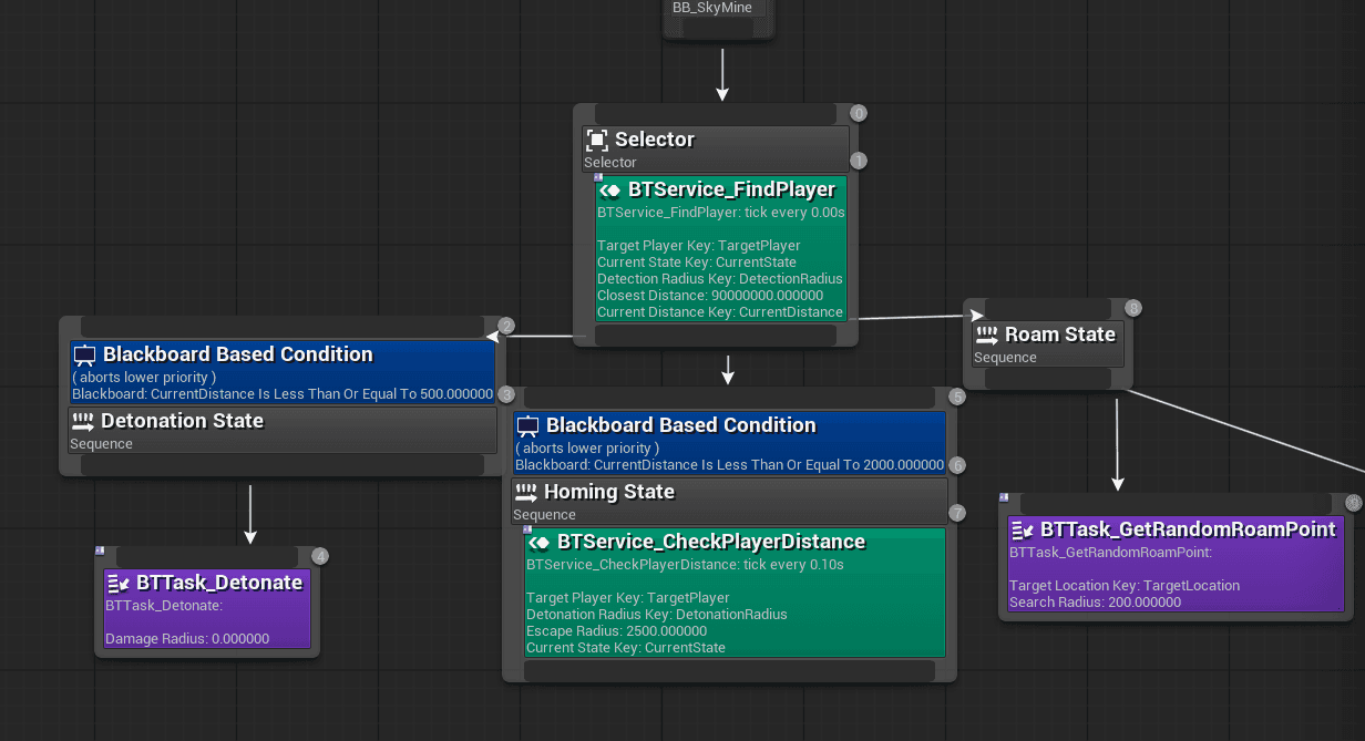 The depth of Unreal's blueprint system amazed me, with how there seemed to be a blueprint node for just about anything. I was drawing parallels between Unity's C# scripting and the blueprint system, which helped a lot with figuring out the necessary logic for checking for nearby players or executing player inputs using Unreal's input mapping contexts. At first we wanted to have the pilot running around to different stations, controlling the different functionalities of the balloon. I quickly found out that maintaining the player's local position in the balloon while it moves through the sky was not possible. I pivoted to a control scheme where the pilot could orchestrate the wheel and the harpoon guns from where they were. In a sense, the player was the balloon. I also designed and blueprinted the AI state logic using Unreal's blackboard system. The behavior tree made understanding the flow of my AI enemies decision making much more apparent. I loved all the dropdown options for priority of tasks. This project served as a great introduction to Unreal 5's workflow and systems, and I can't wait to utilize C++ scripting in conjunction with blueprints later on.